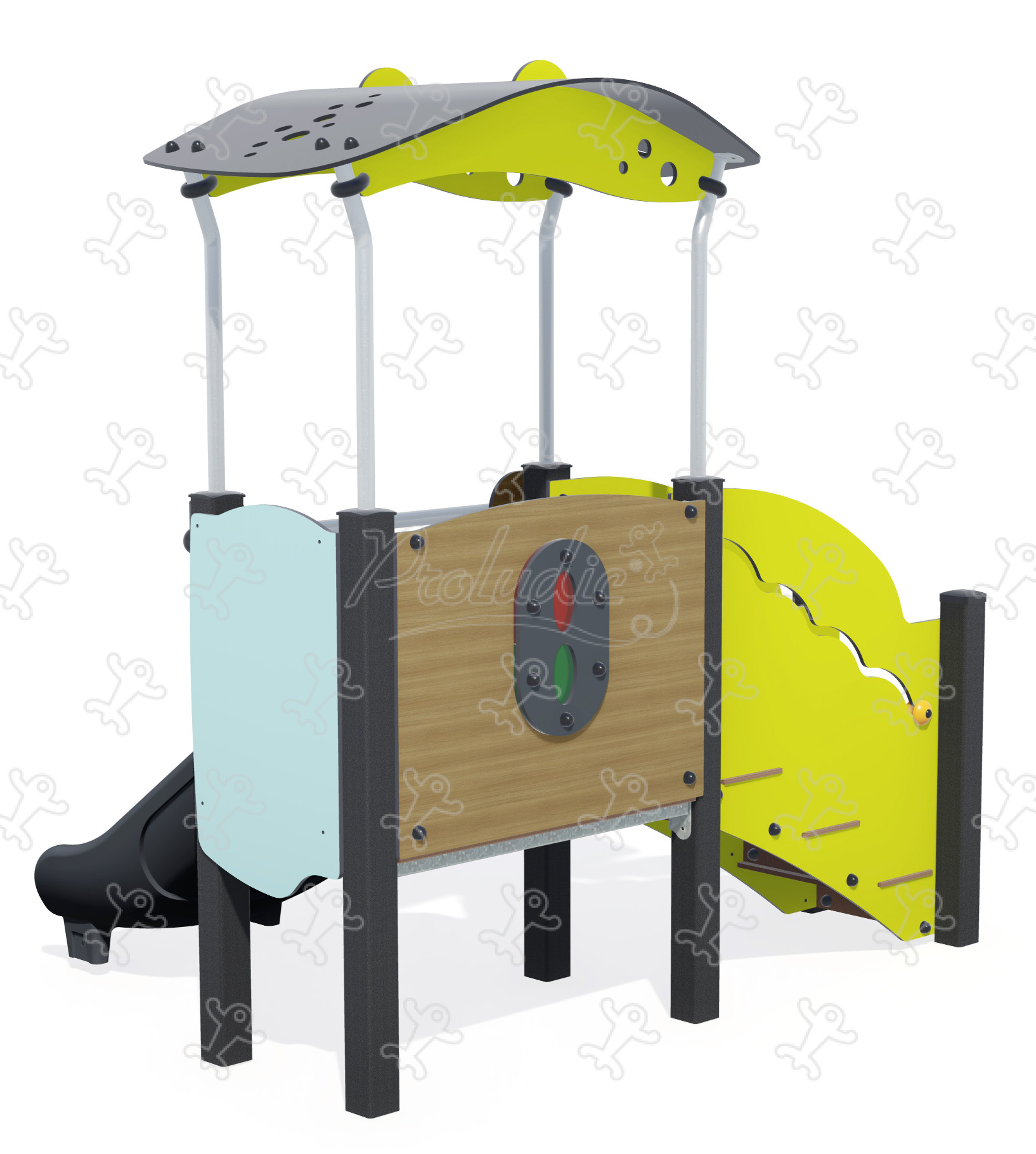 Sprzęt wielofunkcyjny z zjeżdżalnią i małym podniesionym domkiem w pastelowych i drewnianych kolorach - J38132-C®