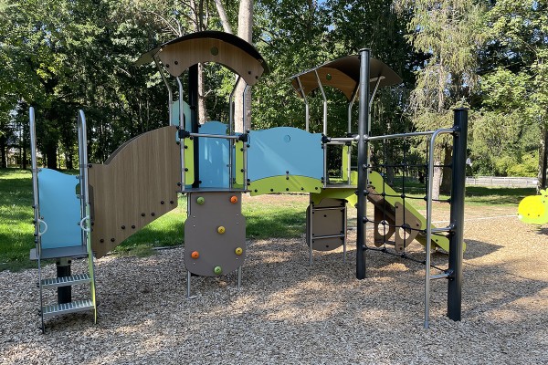 Wyposażenie wielofunkcyjne ze zjeżdżalnią, domkami do zabawy i aktywnościami wspinaczkowymi w kolorach pastelowych i drewna - J3845-C