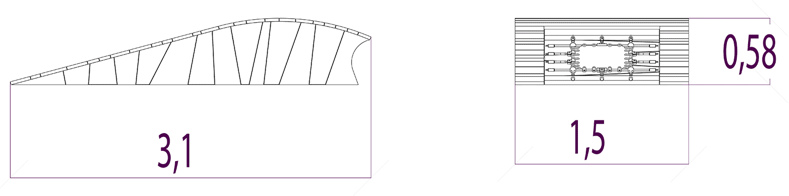 Wymiary modułu to: 3,10 m długość, szerokość: 1,50 m, wysokość: 0,58 m. Wysokość swobodnego upadku wynosi 0,60 m.
