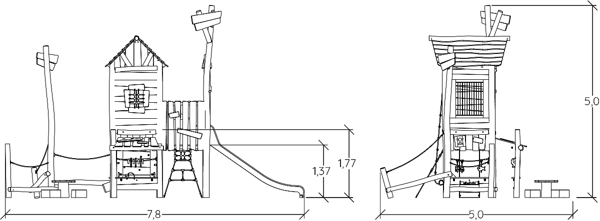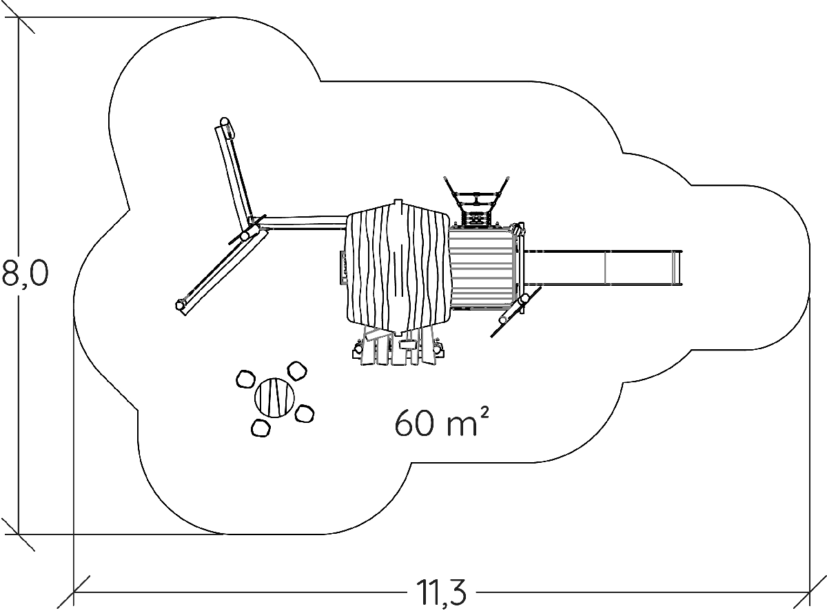 Wymiary modułu to: 7,80 m długość, szerokość: 5,00 m, wysokość: 5,00 m. Wysokość swobodnego upadku wynosi 1,77 m.