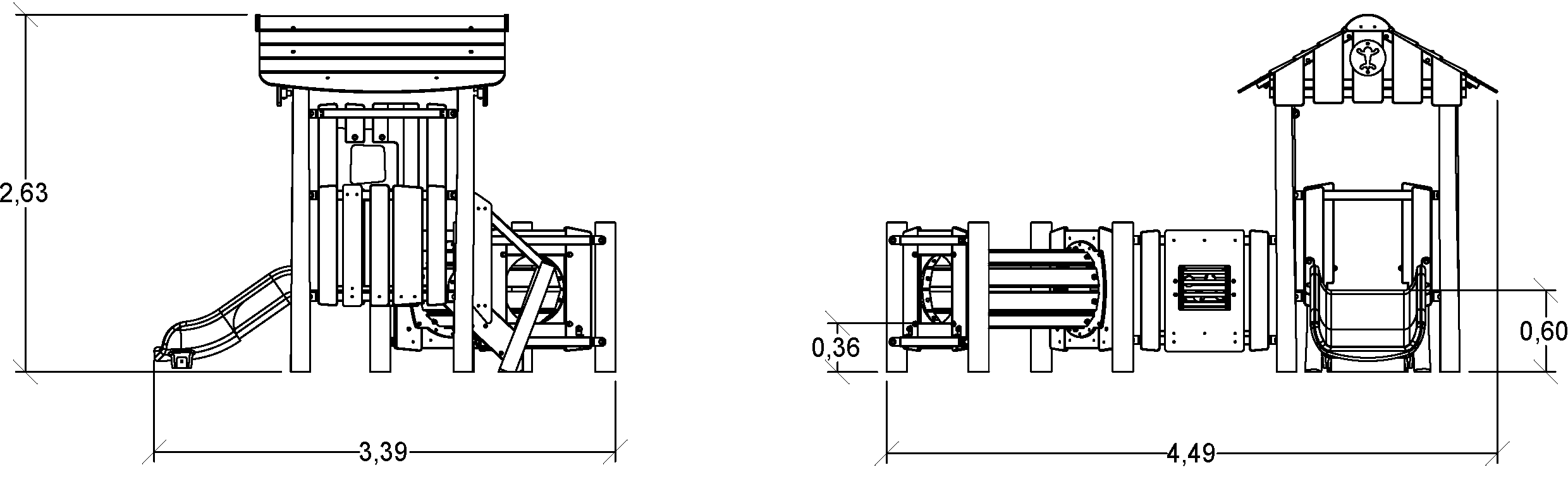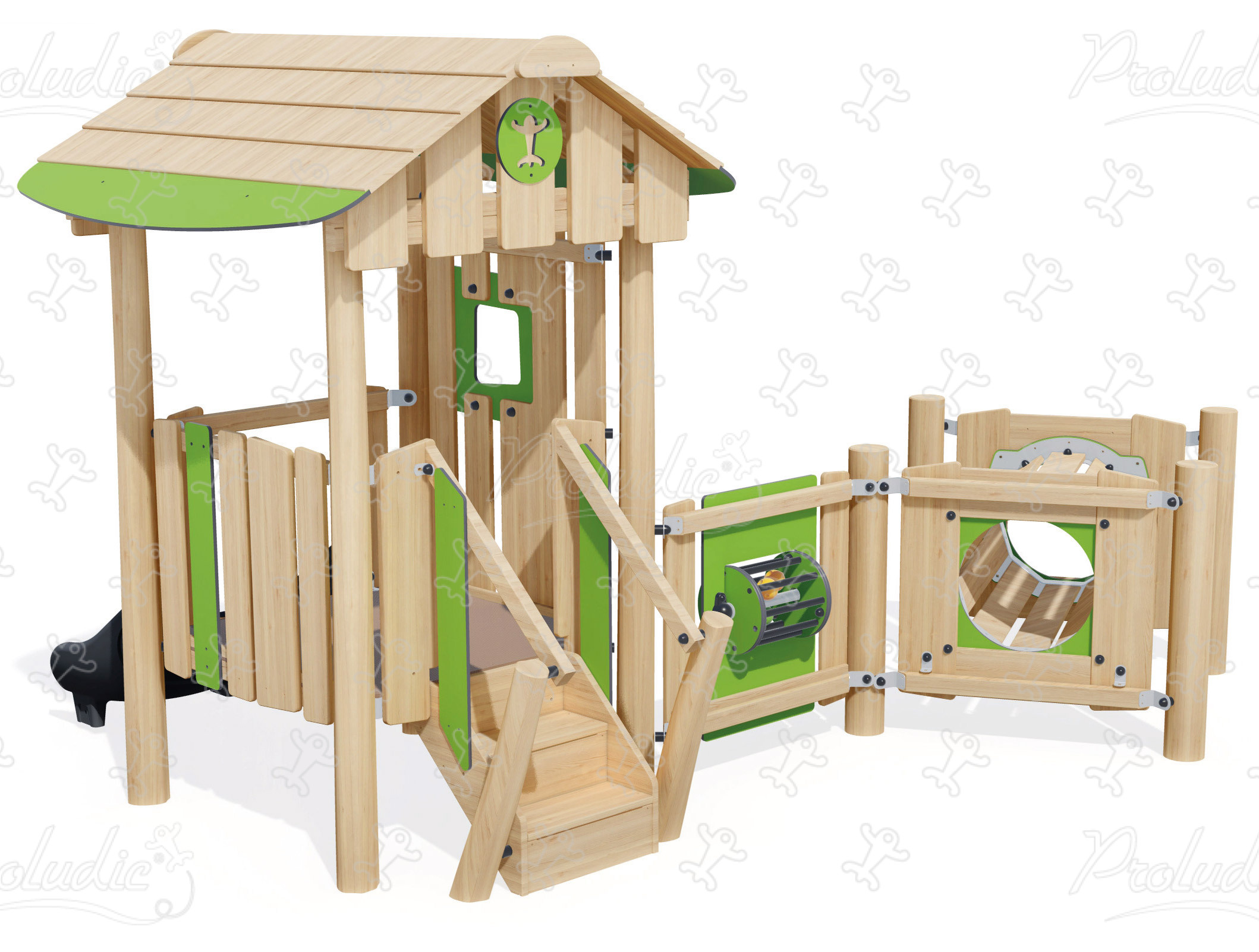 Drewniana konstrukcja do zabawy dla małych dzieci ze zjeżdżalnią, kabiną, tunelem i kołem muzycznym - J49252®