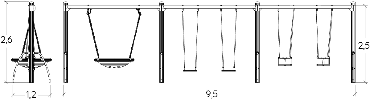 Zestaw huśtawek z czarnym siedziskiem kubełkowym, 2 płaskimi siedziskami i 2 siedziskami kubełkowymi - J493