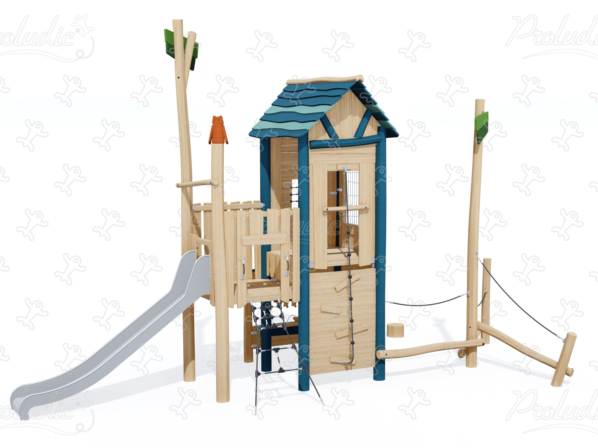 Mała Chata - Drewniane urządzenie placu zabaw z manipulacyjnymi zabawkami, ścieżką do balansowania, wieżą i zjeżdżalnią - J49305®