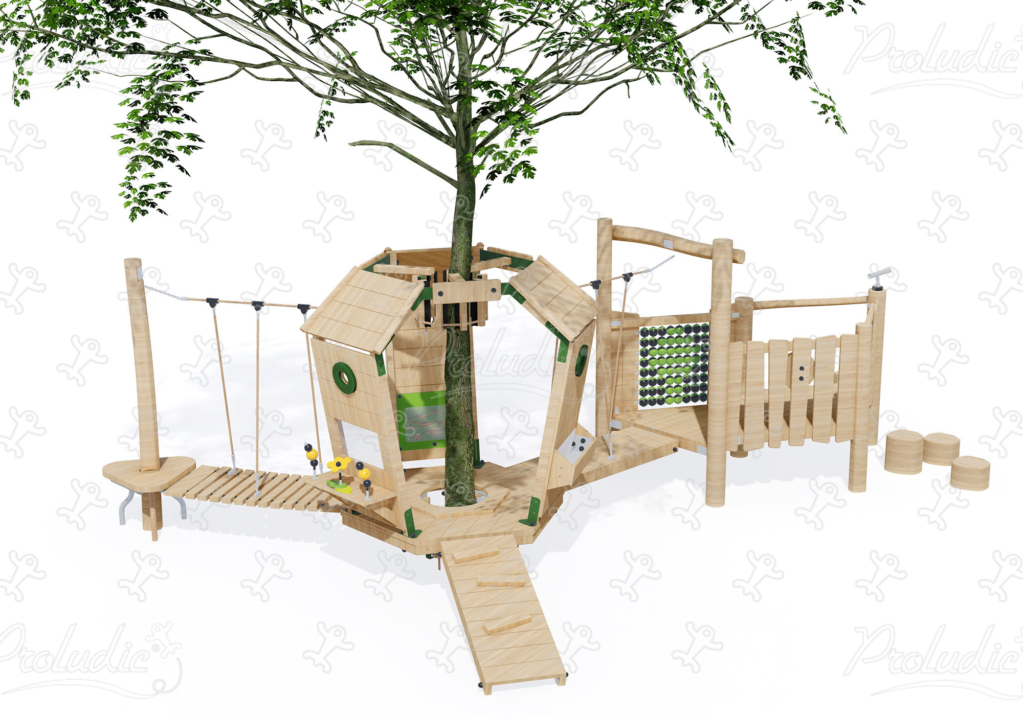 Platforma połączona z drzewami z domkiem na drzewie i panelem do zabawy - J49902®