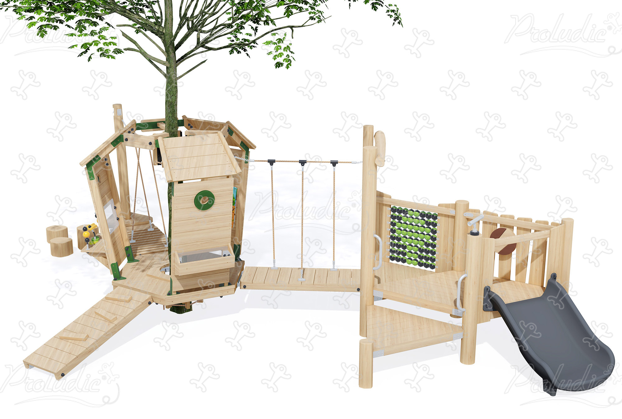 Platforma połączona z drzewami z domkiem na drzewie i panelem do zabawy - J49903®