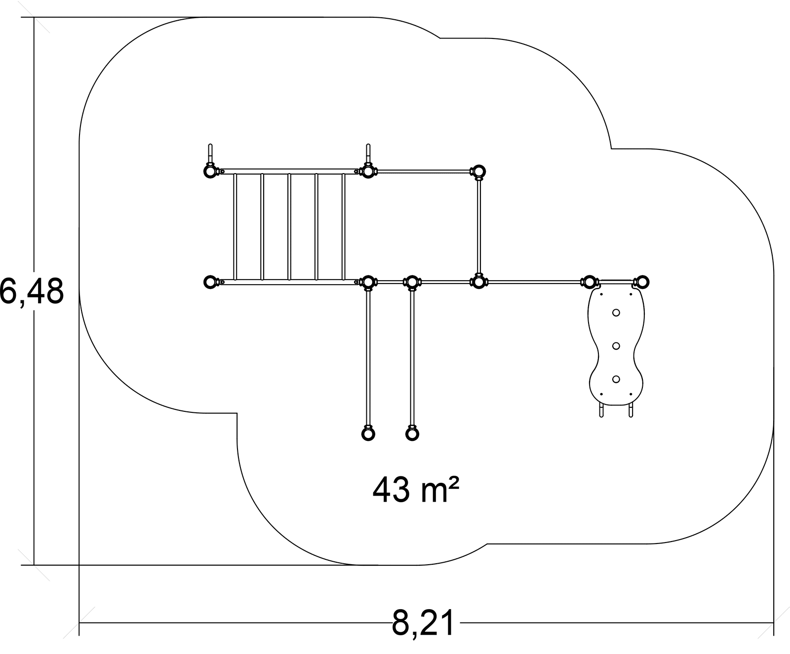 Wymiary modułu to: 5,21 m długość, szerokość: 3,48 m, wysokość: 2,52 m. Wysokość swobodnego upadku wynosi 1,43 m.