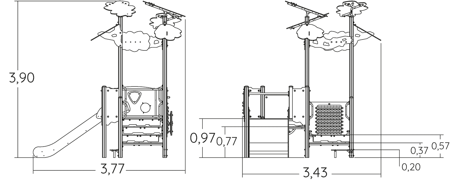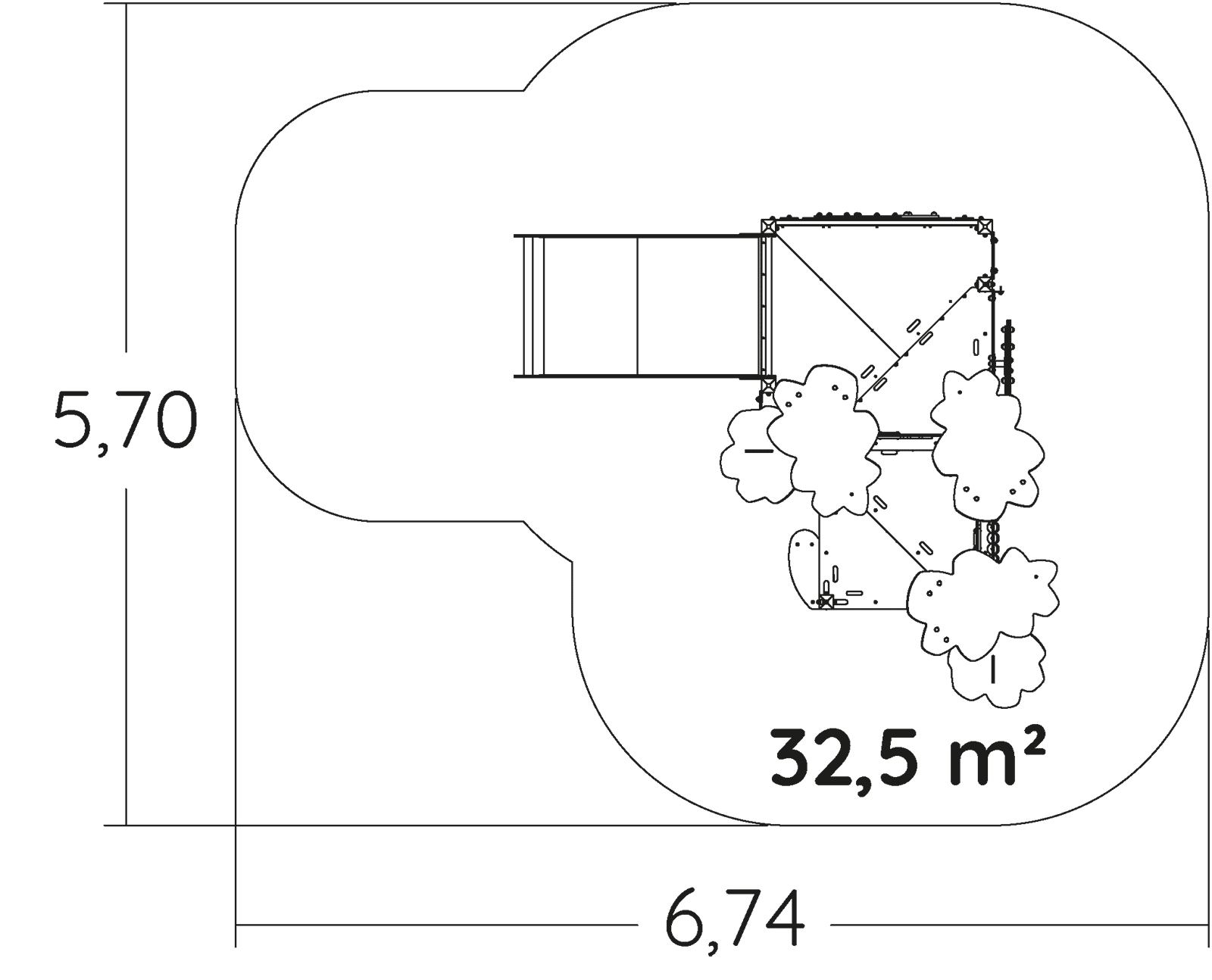 Wymiary modułu to: 3,77 m długość, szerokość: 3,43 m, wysokość: 3,90 m. Wysokość swobodnego upadku wynosi 1,00 m.