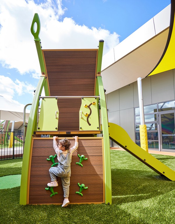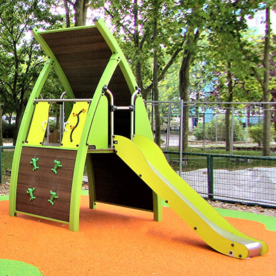 Wyposażenie wielofunkcyjne z podwyższonym domkiem do zabawy, aktywnościami wspinaczkowymi i zjeżdżalnią - J5602