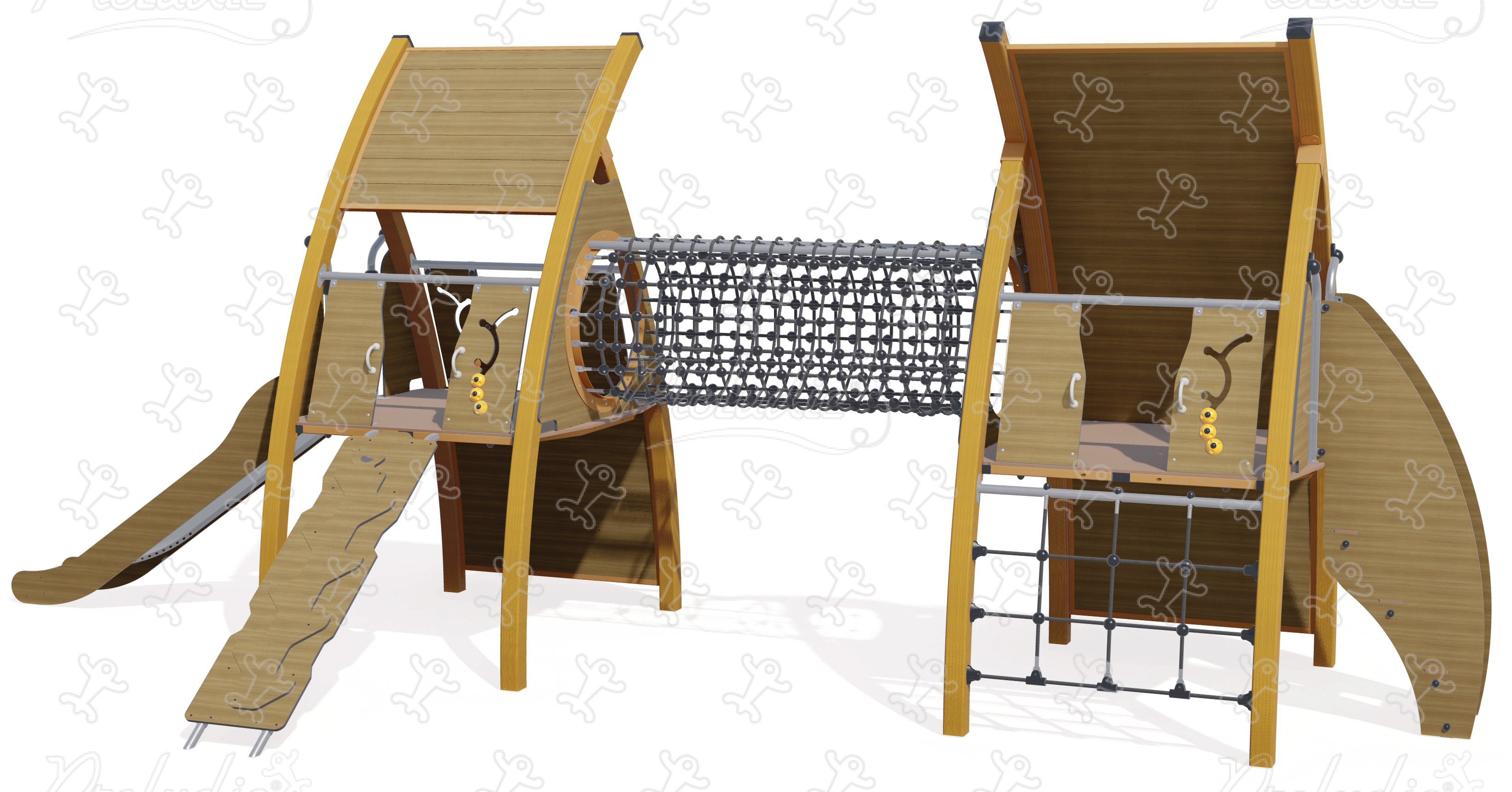 Urządzenie wielofunkcyjne ze ścianką wspinaczkową, tunelem siatkowym, podwyższonymi domkami do zabawy i zjeżdżalnią w kolorze drewna - J5622-C®
